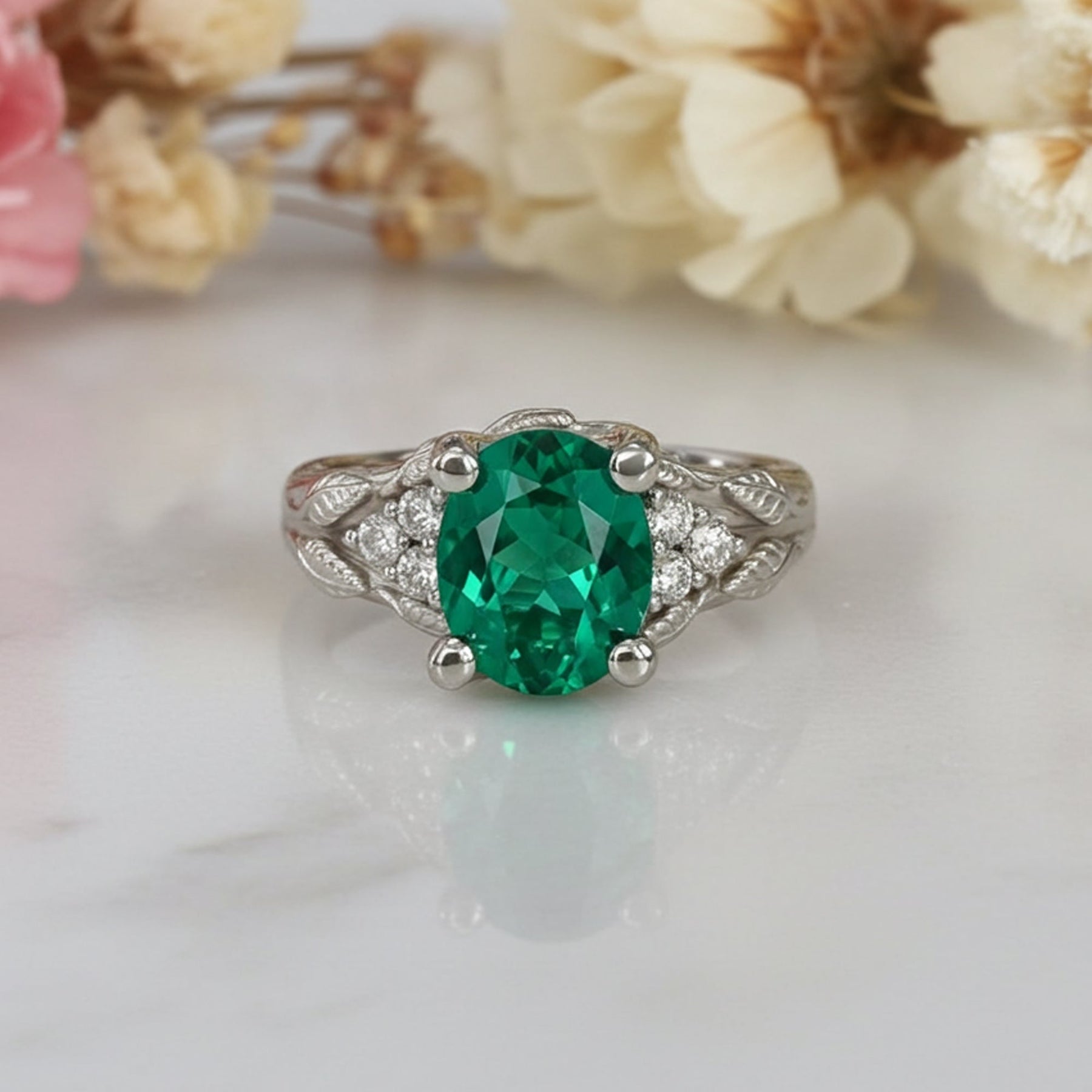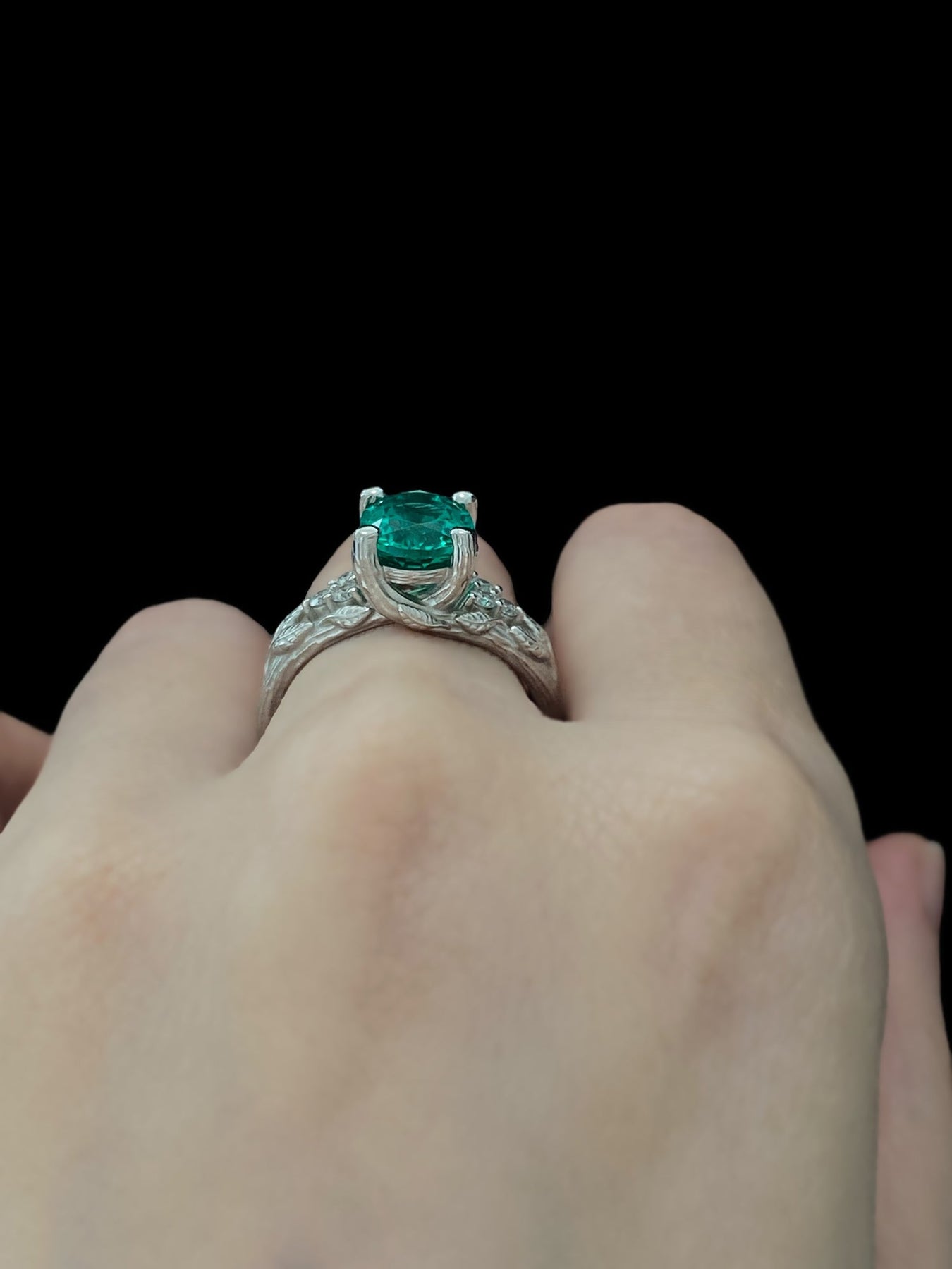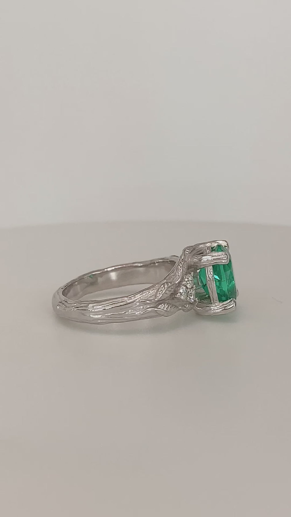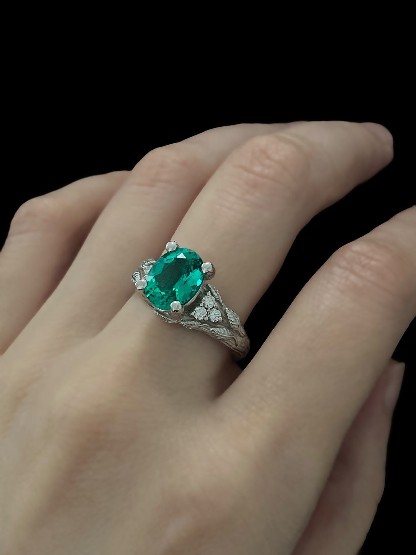 This ring tells the story of a dragon guarding its treasure deep within an enchanted forest. At its heart rests an oval lab-grown emerald, encircled by small sparkling stones and delicate leaves. Twisting branches intertwine, capturing the magic of nature and mythical worlds in a wearable piece of art.