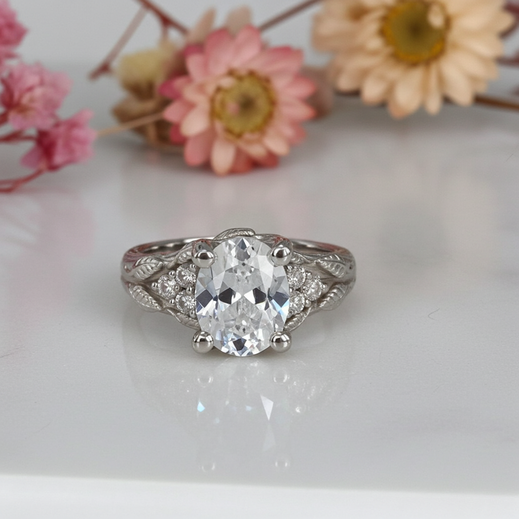 woodland leaf ring, 14k white gold ring with an oval diamond.
