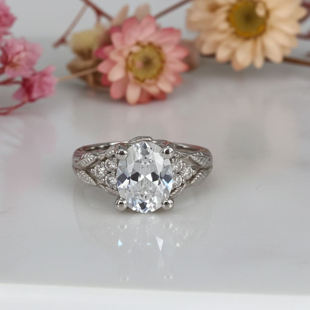 A fantasy-inspired engagement ring featuring an oval center stone accented by sparkling side stones, with leaves and branch details. An intertwining setting structure highlights the center stone. Inspired by the image of a dragon guarding its treasure deep within an enchanted forest, the ring reflects refined craftsmanship with subtle mythical symbolism.