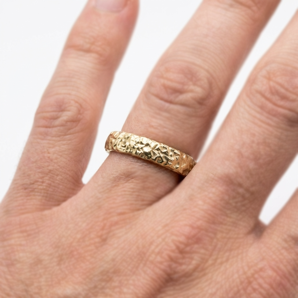 Sculptural hand-carved wedding band with an abstract organic texture. The textured surface catches light from different angles. The contoured profile and comfort-fit interior are designed for everyday wear.